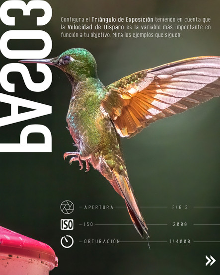 Para capturar todos os detalhes de um beija-flor em pleno voo - especialmente no caso das asas - a velocidade de disparo deve ser altíssima. Considere um mínimo de 1/2000s e o ideal por volta de 1/4000s.